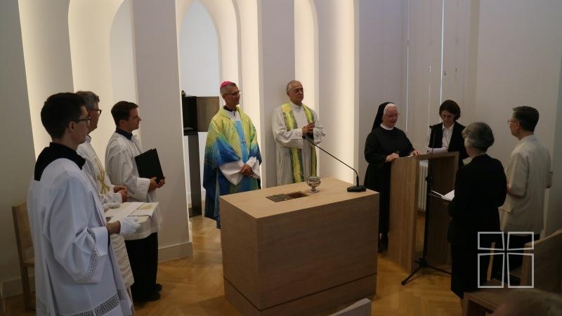 A hitvallást és egyetemes könyörgéseket követően, Petra nővér átadta a rend három boldoggá avatott tagjának ereklyéjét. Boldog Ulrika Nisch, Boldog Maria Theresia Scherer anya és Boldog Zdenka Schelingova nővérek ereklyéit püspök atya megáldotta, majd elhelyezte az újonnan felszentelendő oltárba. Az oltár öt helyen történt megkenése után, a püspök megtömjénezte az oltárt, a kápolnát és a híveket.